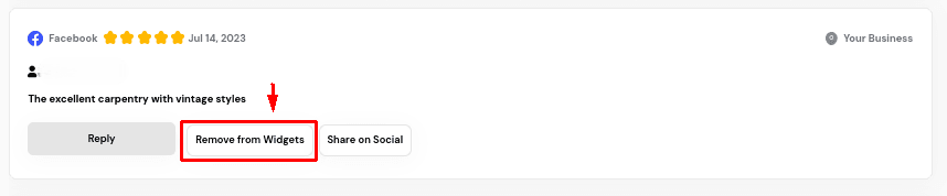 - To exclude a review from the widgets, go to the Reviews section and click on “Remove from widgets.”